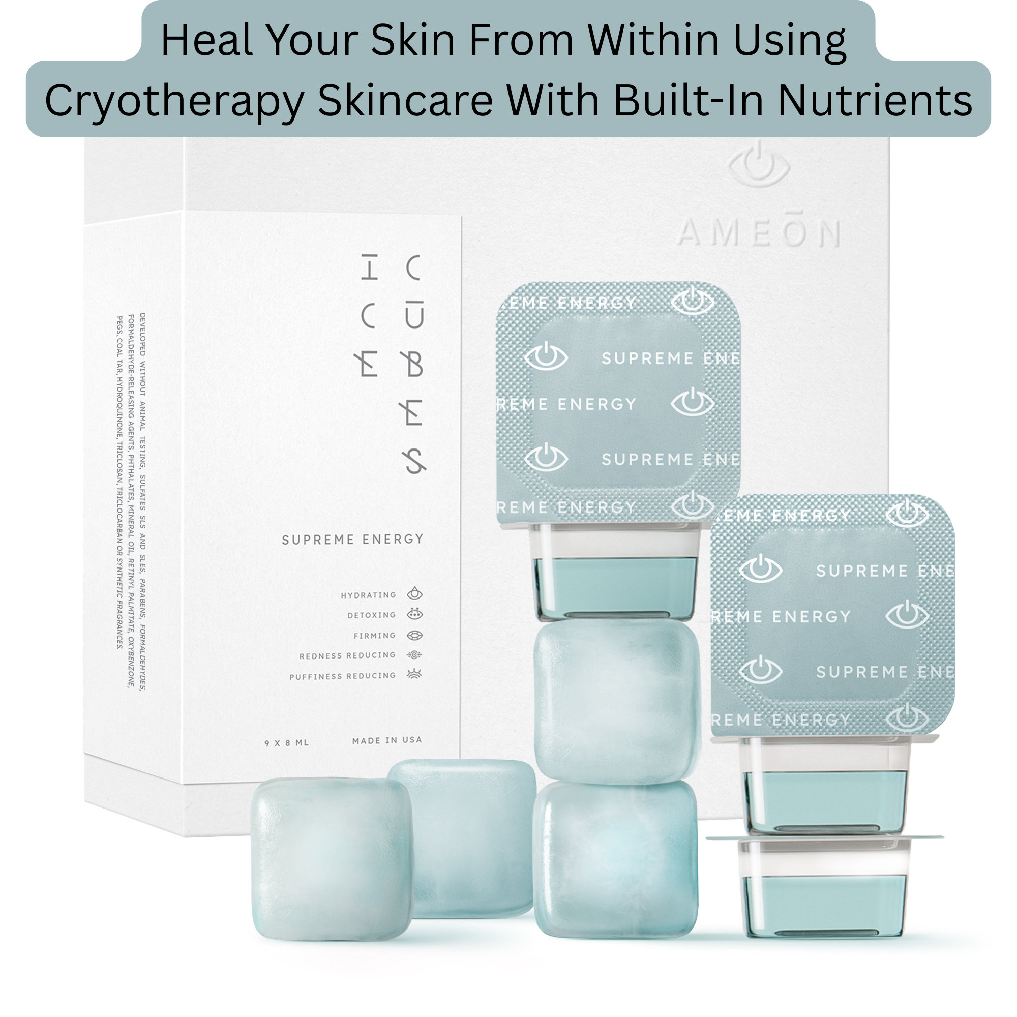 AMEŌN Ice Cubes are a miracle essence that preps the skin to more effectively absorb AMEŌN serum and moisturizer to boost cell rejuvenation.